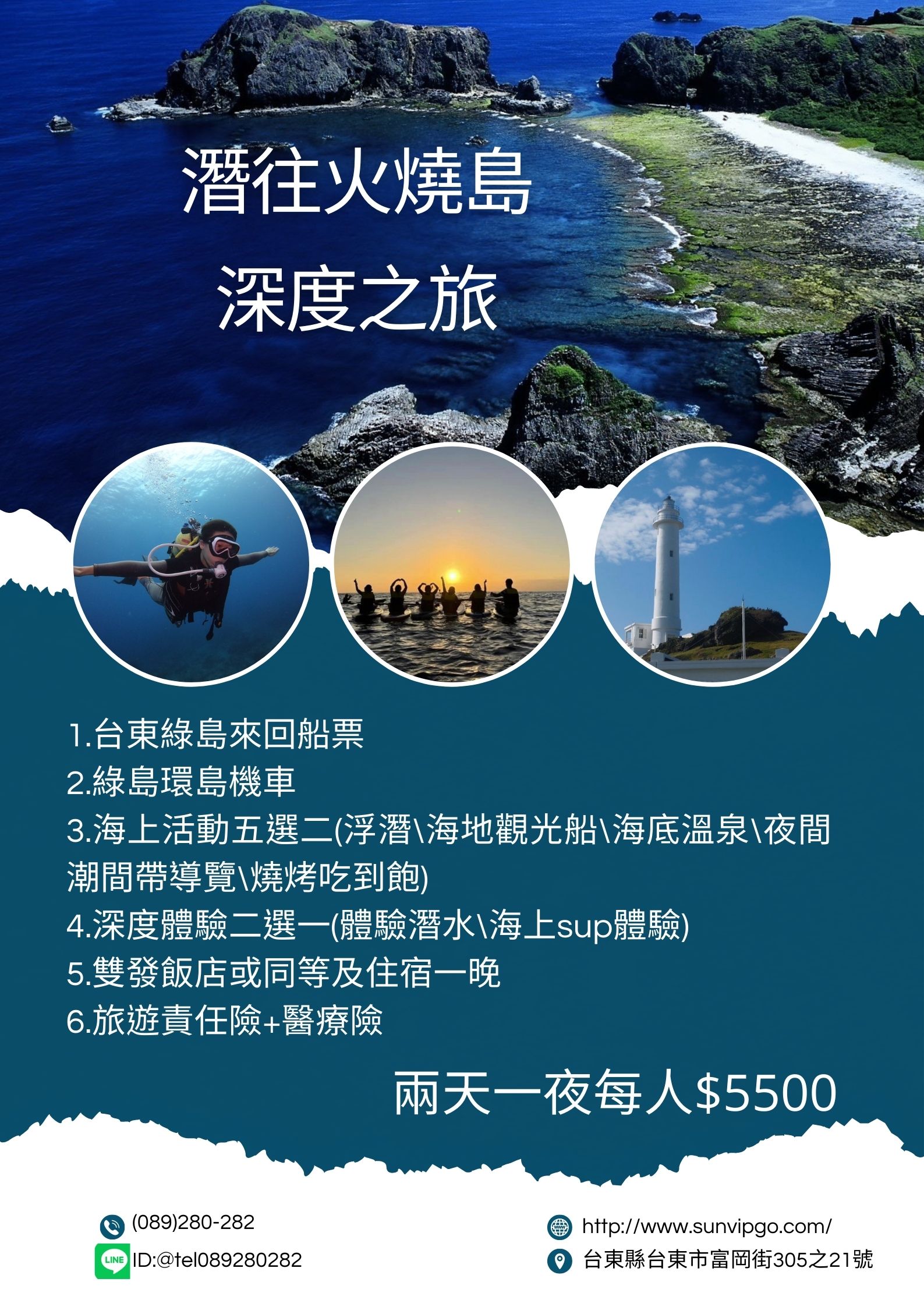 至富岡碼頭(東島旅行社服務處)→富岡港口搭乘(豪華快輪)前往綠島→專人接船前往住宿區(寄放行李)→南寮逛大街→海洋浮潛之旅欣賞綠島海底風景體驗與在天空的小鳥般飛翔的暢快自在享受悠游海中世界的美好。在石朗,軟珊瑚隨著海流輕輕地擺動柔軟的身軀→觀星、探月夜遊去【賞梅花鹿】甚至螢火蟲→朝日溫泉賞星星珍貴的應屬世界上少有的《海底溫泉》。